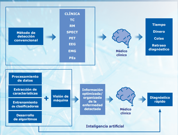 Hay más de 600 enfermedades relacionadas con el sistema nervioso, siendo las más frecuentes la enfermedad de Parkinson (EP), la enfermedad de Alzheimer (EA), esclerosis múltiple (EM), epilepsia, demencia, cefaleas, infecciones, accidente cerebrovascular, lesiones cerebrales traumáticas y tumores entre otras. Hasta el momento estas enfermedades neurológicas son identificadas inicialmente mediante la historia clínica y la exploración neurológica. Herramientas procedentes de la IA tienen un amplio espectro de utilidad en este campo ya que pueden apoyar el diagnóstico híbrido de eventos como un accidente cerebrovascular a partir de imágenes, retinopatías a través del análisis automático de fundoscopias o fotografías retinianas, interpretar el electroencefalograma (EEG) para predecir crisis convulsivas, predecir la conversión de un deterioro cognitivo leve en demencia de Alzheimer, clasificar las enfermedades neurodegenerativas etc.