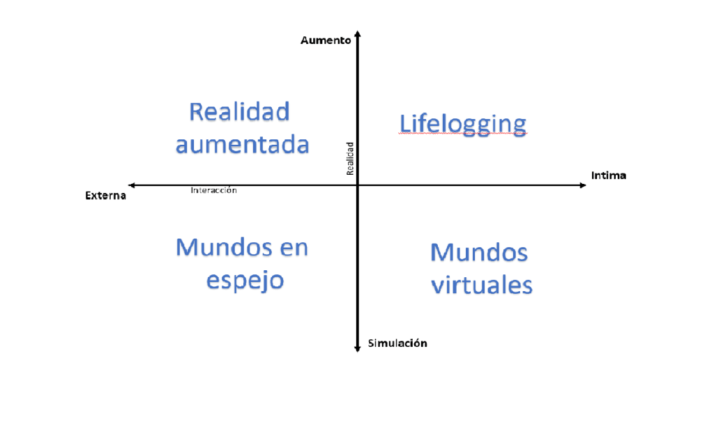 Con base en lo anterior y dependiendo de que tanto se aumente o simule la realidad, así como  la profundidad de la interacción, se han definido cuatro reinos en los cuales puede navegar el habitante del metaverso: Realidad aumentada, lifelogging, mundos en espejo o mundo virtual (Ver gráfico). El habitante del mundo metaverso puede hacer transiciones entre cada uno de ellos dependiendo de la personalización de su experiencia. Es decir, el habitante avatar puede estar en la sala física de su casa viendo un video con dos de sus amigos, pero a la vez en un escenario virtual jugando Minecraft ® con otros dos, uno de los cuales a su vez estará en la sala física de su casa. En el contexto de lifelogging en salud por ejemplo usted puede estar en un viaje a Europa en su hotel pero conectarse virtualmente a la sala de consulta de su médico para preguntarle sobre la conveniencia o no de incluir un vino con su dieta mediterránea, mientras el mismo médico analiza las dinámicas de sus signos vitales capturados por biosensores.