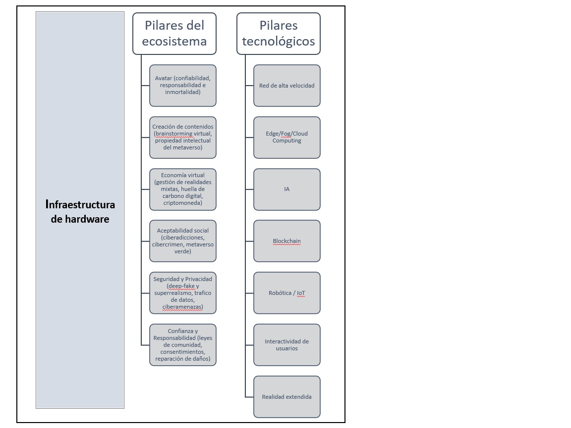 Ahora bien, el metaverso tiene una estructura de bloques construidos mediante 8 pilares: Infraestructura de hardware, Realidad extendida y simulada (virtual y aumentada), Redes de alta velocidad, Cloud, Edge y Fog computing, Robótica, Internet de las cosas IoT, inteligencia artificial e hiperalojadores (DLTs y blockchain). Dicha estructura permite generar el objetivo central del metaverso: Un universo de espacios en 3D, compartidos, concurrentes y encadenados.