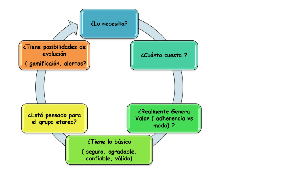 Así que la próxima vez que usted le diga a un paciente que “hay que comer bien y hacer ejercicio”, como parte de una recomendación terapéutica, recuerde que esto puede terminar siendo solamente un consejo, una bienaventuranza. Estás recomendaciones deben hacer parte de un análisis minucioso y personalizado del paciente, evaluando sus dimensiones y entorno. Dentro de dicho análisis debe considerarse el beneficio y la posibilidad del uso de dispositivos electrónicos portátiles como elemento de medición e inclusive adherencia, apoyando la práctica clínica y actuando como elementos de soporte, en lugar de dejar trabajar a estas tecnologías en forma independiente. Si esto se hace así es posible que los pacientes aprendan y ejecuten mejor un cambio de comportamiento enfocado en salutogénesis. Así que en el momento de recomendar, o usar un dispositivo no olvide hacerse estas 6 preguntas: