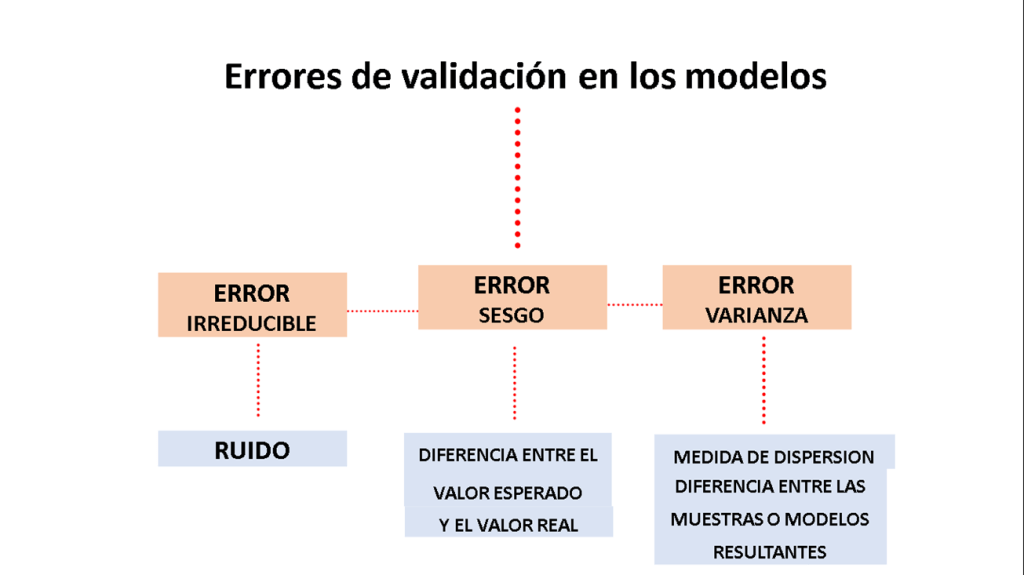 Para comprender el underfitting y overfitting, se deben introducir elementos conceptuales que expliquen como el error de validación nos permite entender el equilibrio o desequilibrio de un modelo de ML en su etapa de entrenamiento. En este orden se debe definir el error irreductible, que se refiere a datos anómalos y variables desconocidas, que también se conoce como ruido; el error de sesgo que es la diferencia entre la predicción esperada del modelo y los valores verdaderos, y se relaciona con la exactitud; el error de varianza que es una medida de dispersión, que indica cuanto varia la predicción según los datos que utilicemos para el entrenamiento, y se relaciona con la precisión.