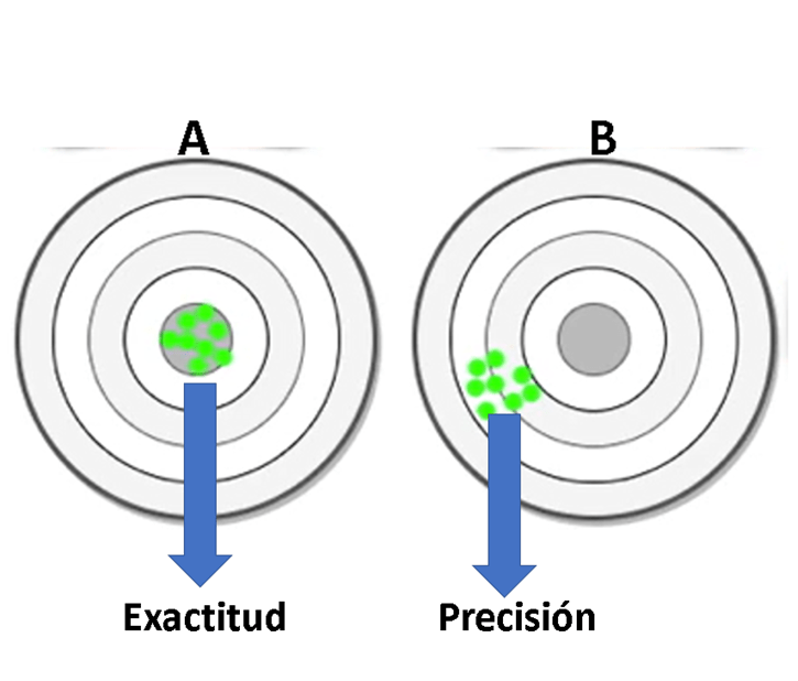 Es importante ampliar el concepto que relaciona precisión/varianza, que se refiere a la dispersión del conjunto de valores obtenidos de mediciones repetidas de una magnitud, e indica que, cuanto menor es la dispersión de los datos mayor es la precisión. Asimismo, la relación exactitud/sesgo indica cuan cerca del valor real se encuentra el valor medido. Las relaciones mencionadas y el comportamiento de los datos pueden explicarse mejor, si tomamos como ejemplo los disparos a una diana. La precisión y la exactitud en el disparo tienen que ver con la concentración de los impactos alrededor del centro de la diana. En la figura A se observa un alto grado de precisión dado que todos los disparos se concentran en un espacio pequeño y, un alto grado de exactitud dado que los disparos se concentran sobre el centro de la diana. En la figura B, el grado de precisión es similar al de la figura A, los disparos están igual de concentrados, pero, la exactitud es menor, dado que los disparos se han desviado separándose del centro de la diana.
