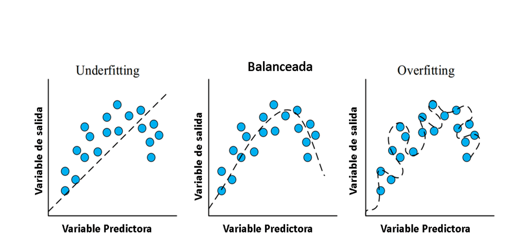 Underfitting: Es un modelo con pobre captura de información y por tanto el desempeño sobre el set de datos de entrenamiento es pobre lo que no permite su generalización.