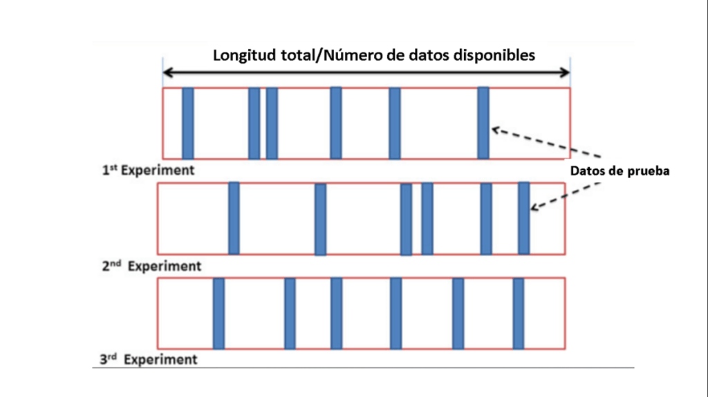 Muestreo aleatorio (Random subsampling): repite el método holdout muchas veces (k-veces) y calcula la media de las exactitudes obtenidas. El submuestreo aleatorio realiza K divisiones de datos del conjunto de datos, cada división selecciona aleatoriamente un número fijo para realizar las pruebas sin realizar reemplazo. Para cada división de datos, volvemos a entrenar al clasificador desde cero. El Problema de las exactitudes calculadas es que no son datos independientes, y con esta técnica no hay control sobre los ejemplos que ya han sido usados para entrenamiento. Es decir, la verdadera estimación del error con la métrica utilizada para evaluarlo es obtenido con o el promedio de las estimaciones separadas, y esta estimación en ocasiones es significativamente mejor que la estimación reservada.