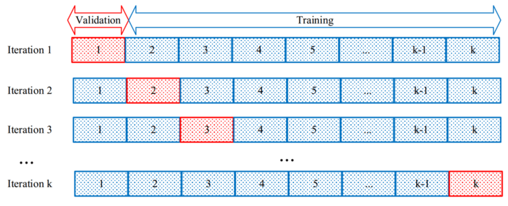 Validación cruzada (cross-validation)- con k pliegues(K-Fold): es donde un conjunto de datos se divide en un número K de secciones / pliegues donde cada pliegue se usa como un conjunto de prueba en algún momento. Tomemos el escenario de validación cruzada de 4 partes (K = 4). Aquí, el conjunto de datos se divide en 4 pliegues. En la primera iteración, el primer pliegue se usa para probar el modelo y el resto se usa para entrenar el modelo. En la segunda iteración, el segundo pliegue se utiliza como conjunto de prueba, mientras que el resto sirve como conjunto de entrenamiento. Este proceso se repite hasta que los 4 pliegues se hayan utilizado como conjunto de prueba.