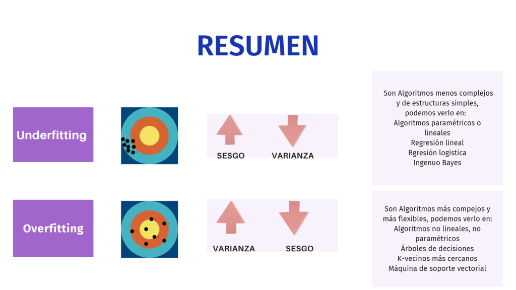 Los conceptos descritos anteriormente, permiten ubicar el underfitting en los casos en que el modelo de aprendizaje automático es simple en relación con la complejidad del problema y con el tamaño del conjunto de datos. Este modelo de aprendizaje se caracteriza por tener un rendimiento débil tanto en conjuntos de entrenamiento como en conjuntos de validación, entonces el infrajuste es de fácil detección a la luz de sus métricas de rendimiento. Con pocos datos el modelo no es preciso ni exacto, por tanto, presenta un sesgo alto y una varianza baja. Para overfitting, el modelo de aprendizaje automático es complejo, con más parámetros y con un conjunto de datos mayor, comporta un rendimiento eficiente en el entrenamiento, pero resulta ineficiente en la validación, este caso tiene una varianza alta y un sesgo bajo.