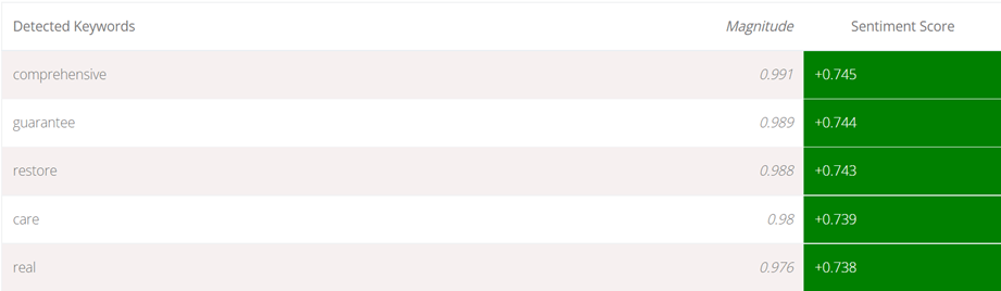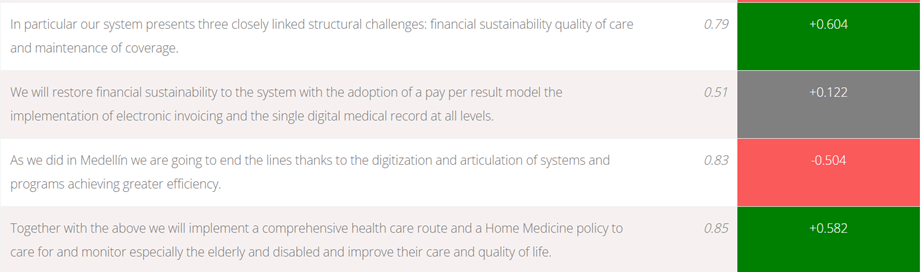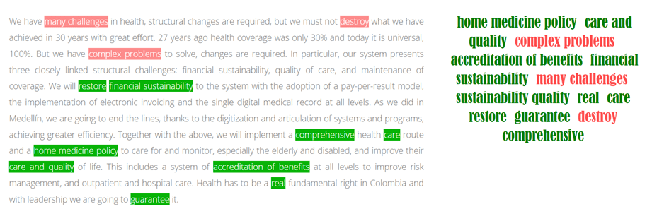 El texto propuesto es corto, con un sentimiento general positivo pero a diferencia del análisis arrojado para el programa de Colombia Humana se centra especialmente en dos grandes elementos semánticos: El llamado a la no destrucción de los logrado en 30 años, en una clara alusión a la propuesta de Colombia Humana y a los inmensos retos del sistema de salud con enfoque de calidad. Al final tiene un componente global superior en magnitud al proyecto de Colombia Humana pero con un enfoque en mi percepción de mayor superficialidad técnica y con un anhelo especialmente de no destruir los logros más que en el detalle de la resolución de los retos o la propuesta de ejecución de un tema tan importante como la domiciliación del cuidado que está incluído en esta propuesta. Bien haría en profundizarse el detalle técnico de la misma.
