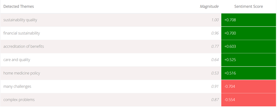 Dentro de los temas detectados en el sentimiento positivo lidera la “calidad y sostenibilidad”, “la sostenibilidad financiera”, la “acreditación de beneficios”, la “atención con calidad” y la “política de atención domiciliaria”. Los temas detectados como de sentimiento negativo se restringen a los “múltiples retos” y “problemas complejos”.