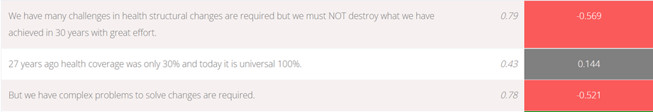 Muy alineado con la estructura textual de los sentimientos la frase más relevante, clasificada como de sentimiento negativo es “tenemos muchos retos y se requieren cambios estructurales pero no debemos destruir lo que se ha logrado en 30 años con gran esfuerzo”.