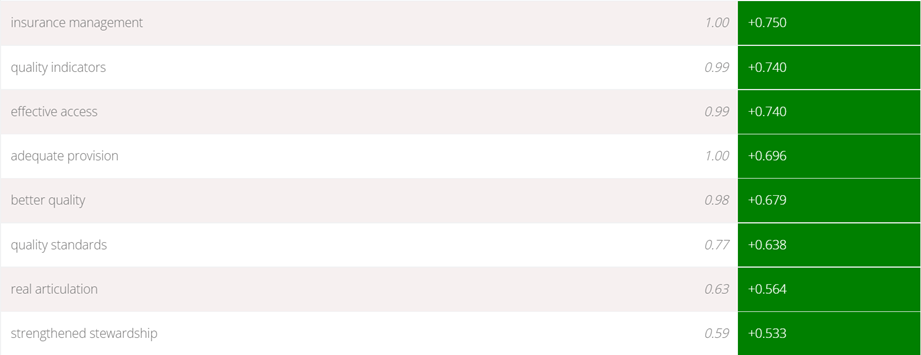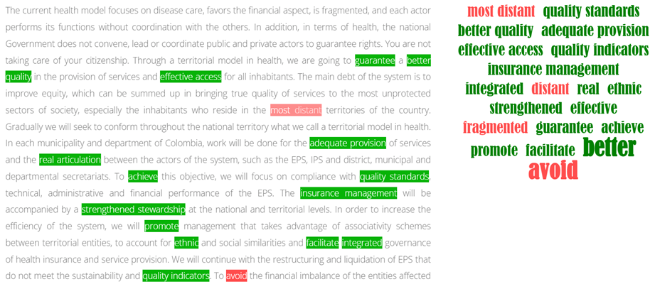 Las palabras clave catalogadas como sentimiento positivo fueron “estándares de calidad”, “mejor calidad”, “provisión adecuada”, “acceso efectivo”, “indicadores de calidad”, “gestión del aseguramiento”, “integrado”, “real” e “étnico”, “fortalecido”, efectivo, “garantizar”, “lograr, “promover”, facilitar y “mejor”. Como puede verse la palabra mejor y el énfasis en calidad resaltan.
