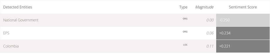 Las entidades detectadas fueron gobierno nacional, EPS y Colombia. Esta ùltima ha sido una entidad común para los tres programas analizados, este el el primero que incluye como tal el nombre de EPS dentro de las entidades.