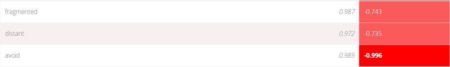 Las palabras relacionadas con sentimientos negativos son “evitar” como dominante seguida de “fragmentado” y “distante”, esta última siendo de alta calificación también como tema detectado.