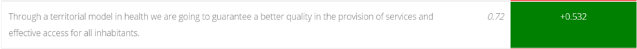 El texto propuesto es el de mayor valoración positiva e incluye conceptos de mayor relevancia técnica que los otros dos programas. Al incluir palabras de mayor dominancia positiva se genera una conexión mayor con el texto sin recurrir como en el programa de Colombia Humana a un contexto reivindicatorio o como en el de Gutiérrez/Lara a uno de evitar el riesgo de destrucción de lo logrado. Mi percepción desde la semántica es que es el texto de mayor equilibrio en sentimientos y posiblemente el más técnico de los tres.