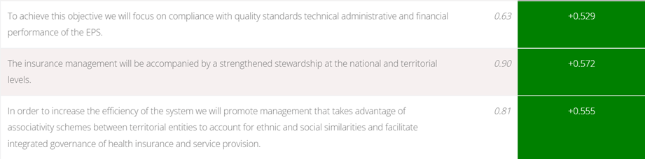 Las frases calificadas como clave en el sentimiento positivo se centran en la gestión de la calidad y la de mayor peso es “la gestión del aseguramiento se acompañará de un fortalecimiento en la administración a nivel nacional y territorial. También por primera vez en los programas se encuentra una frase que incluye el componente de eficiencia del sistema incluyendo asociatividad entre las entidades territoriales y en ella se nombra a la gobernanza.