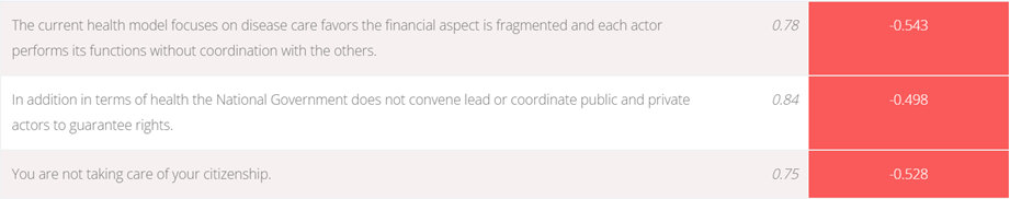 En las frases de sentimiento negativo por su parte predomina el enfoque del sistema actual en la atención de la enfermedad, la fragmentación, falla regulatoria y de atención a los ciudadanos.