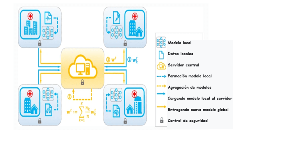 Este servidor central alojaría la red neuronal profunda global entrenado con los datos de las múltiples fuentes, que agregaría las actualizaciones y las contribuciones de todos los participantes y periódicamente cada hospital participante recibiría una copia actualizada, es decir el servidor devolvería los parámetros del modelo global actualizado al servidor local, que mantendrían el conjunto de datos dentro de su propia infraestructura segura, esto permite la capacitación de los algoritmos locales.