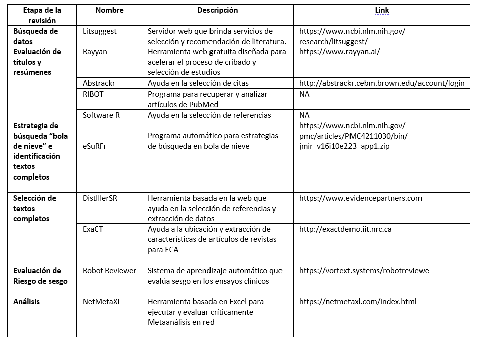 Adaptado de Khalil H, Ameen D, Zarnegar A. Tools to support the automation of systematic reviews: a scoping review. J Clin Epidemiol. 2022 Apr; 144:22-42.