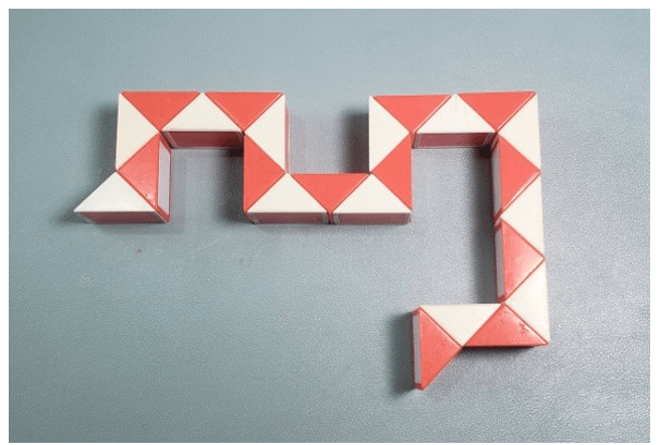 Simplifiquemos entonces la tarea. En lugar de cientos de fichas, vas a recibir una serpiente de Rubik (un juguete armado de prismas triangulares, unidos por un mecanismo de resorte que permite que cada parte pueda rotar, y que puede adoptar diferentes conformaciones – Figura 2). De nuevo, vas a jugar con la serpiente hasta encontrar una forma tridimensional, que cumple una función particular pero no sabes cuál es. A pesar de que está tarea parecería ser un poco más sencilla, sigue siendo casi imposible de concretar. Una serpiente de Rubik normal tiene 24 prismas conectados entre sí, y existen más de 6 billones de estructuras que se podrían lograr moviendo cada una de las piezas de la serpiente [1].