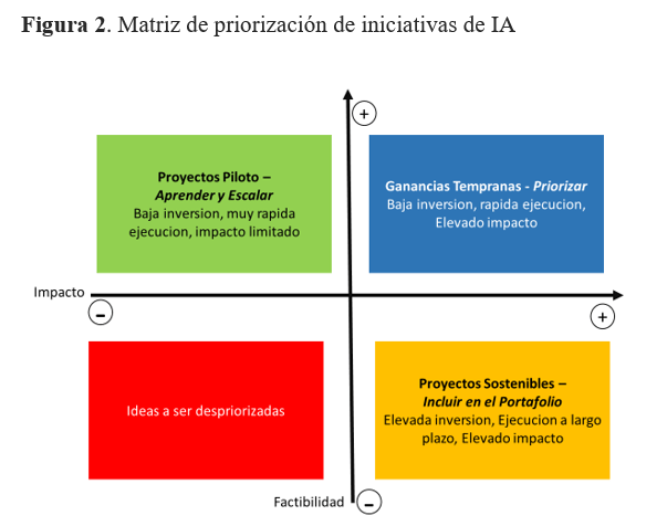 Un enfoque más balanceado sería el de considerar un portafolio de iniciativas de IA compuesto por proyectos de tipo Ganancias Tempranas (Figura 2), que por su baja inversión y elevado impacto van a robustecer la credibilidad y posicionamiento de la IA como concepto; combinados con proyectos tipo Piloto, de rápida y fácil ejecución que comiencen como mínimos productos viables y que, a través de múltiples iteraciones ganen escala e impacto; y, de la misma manera, asegurándose de incluir iniciativas del tipo Proyectos Sostenibles, que por su magnitud requieran de una inversión considerable pero que por su elevado impacto movilicen la organización hacia la verdadera transformación digital.