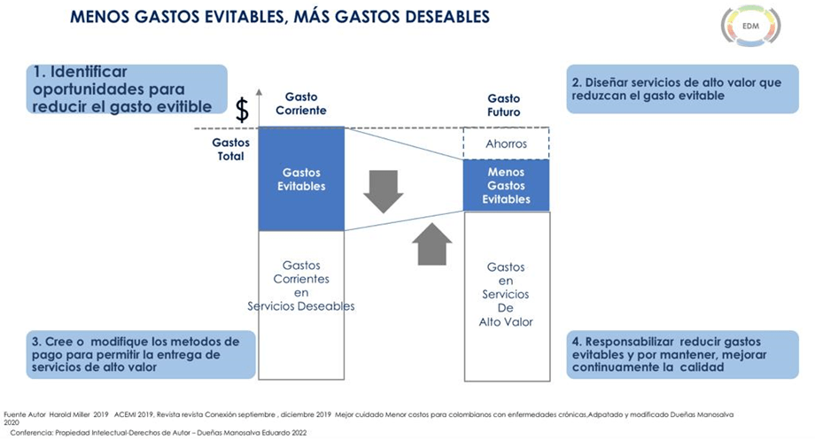 Ante la situación actual de las ineficiencias en salud se han realizado paralelamente estudios con el fin de identificar algunos gastos que podrían ser “evitables” desde el diseño de modelos de atención hasta la contratación de valor en salud, sin afectar la calidad en la atención de los pacientes, algunas investigaciones han demostrado que hasta 40% de los gastos en atención en salud son evitables (4), por lo cual identificar estos gastos es necesario para un mejor resultado puesto que se podría dejar de pagar por servicios evitables, con el simple hecho de no solicitar o prestar el servicio o producto identificado como tal y poder adquirir más servicios de alto valor. En la Figura 1 de Hallar Miller “Menos gastos evitables, más gastos deseables” se describen los 4 pasos para lograr la consigna de una mejor calidad en la atención en salud.