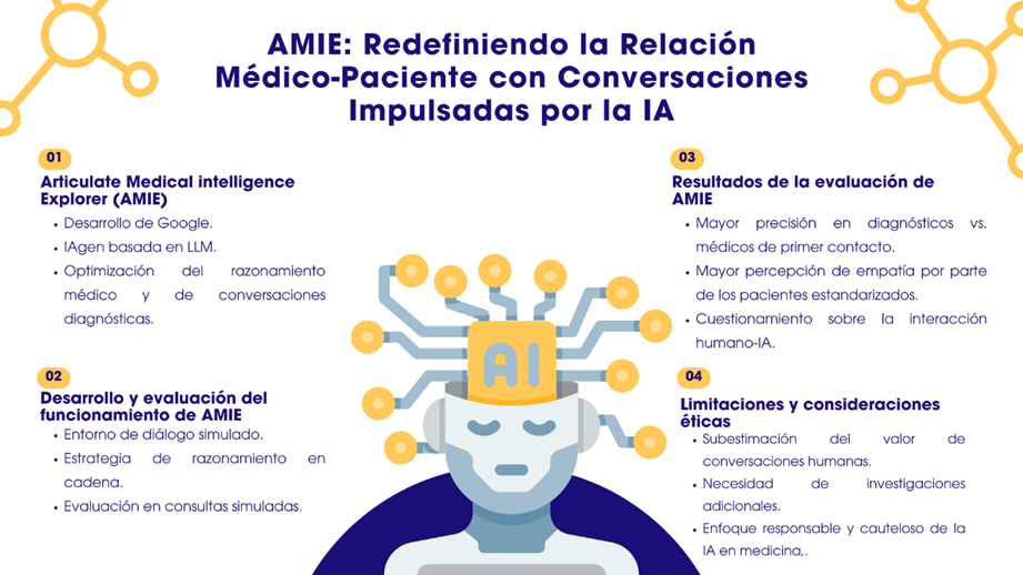 Este trabajo representa una exploración temprana del potencial de la IA en el ámbito médico, subrayando la necesidad de un enfoque responsable y cauteloso. La IA, aunque prometedora, debe abordar desafíos significativos antes de integrarse completamente en la práctica clínica. AMIE es un proyecto de investigación experimental que busca visualizar un futuro donde la IA sea un aliado seguro y accesible para los clínicos en la toma de decisiones diagnósticas y conversaciones médicas.