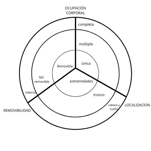 Cuál es del grado de invasión corporal: Si requiere una ocupación corporal total (exoesqueletos), múltiple o única y si tiene o no componentes removibles (ver gráfica)