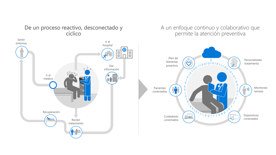 Microsoft promueve el paso de un modelo de salud reactivo, de intervención, desconectado, de pago por evento, a un enfoque continuo y colaborativo que permite la atención preventiva dando paso a un enfoque en salud centrado en la persona y su entorno.