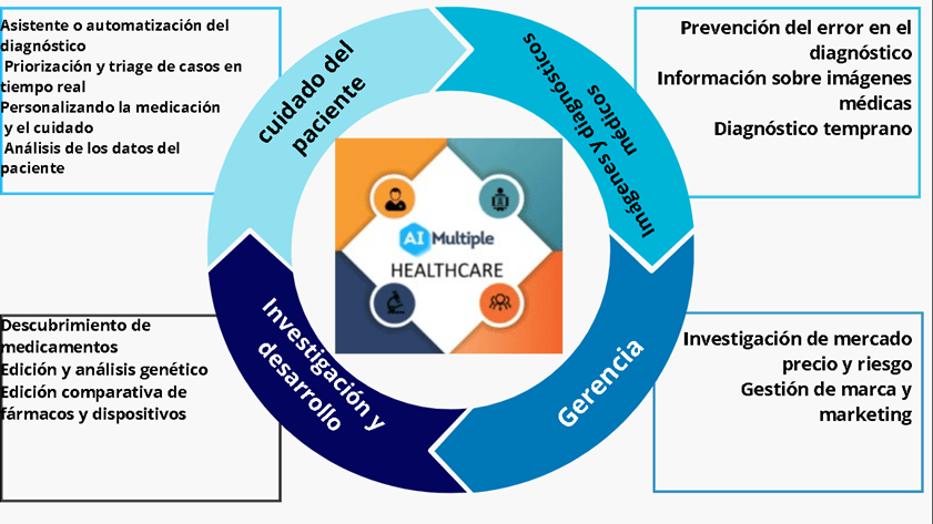 El uso de la IA en el cuidado del paciente, puede ser utilizada como un asistente para la automatización en la generación de probabilidades diagnósticas y prescripción, en la priorización y triage de casos en tiempo real, en la personalizando de la medicación y el cuidado, en el análisis de los datos del paciente; en la utilización de Imágenes y diagnósticos médicos haciendo prevención del error en el diagnóstico y su oportunidad, brindando información sobre imágenes médicas; en el área de Gerencia promoviendo la investigación de mercado, precio y riesgo, gestión de marca y marketing; En la Investigación y desarrollo permitiendo el descubrimiento de medicamentos, edición y análisis genético, edición comparativa de fármacos y dispositivos.