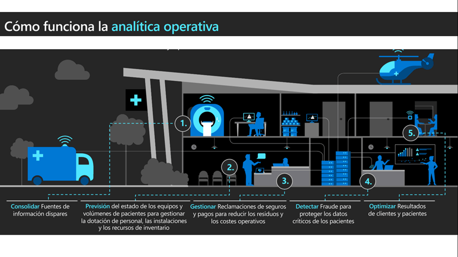 ¿Cómo funciona la Analítica Operativa? Priorizando la atención en función de la necesidad y optimizando los recursos costosos, consolidando fuentes de información dispares, previsión del estado de los equipos y volúmenes de pacientes para gestionar la dotación de personal, gestionar reclamaciones de seguros y pagos para reducir los residuos y los costos operativos, detectar fraude para proteger los datos críticos de los pacientes y optimizar resultados de clientes y pacientes.