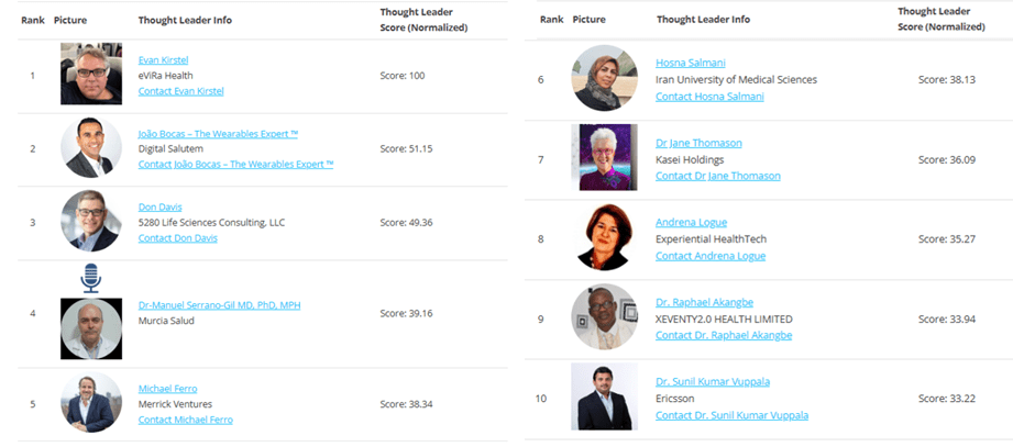 Figura 3: 10 líderes de opinión y personas más influyentes del mundo en el ámbito de la tecnología sanitaria 2024. (Tomado de: https://www.thinkers360.com/top-50-global-thought-leaders-and-influencers-on-healthtech-2024/)