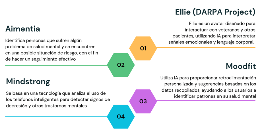 En la figura 5, se relacionan algunas aplicaciones cuyo objetivo es favorecer la salud mental desde el uso de la IA y el análisis del comportamiento humano.