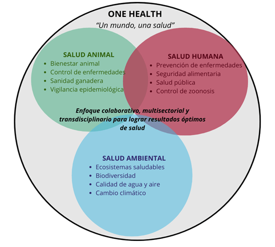El enfoque One Health representa una estrategia mundial que trasciende las barreras tradicionales entre disciplinas, fomentando la colaboración a nivel local, nacional y global con un objetivo claro: alcanzar una salud óptima para las personas, los animales y el medio ambiente. Este concepto integral se sustenta en tres pilares fundamentales interconectados: la salud humana, la salud animal y la salud ambiental (figura 1). La interrelación entre estos elementos resulta esencial para abordar grandes desafíos de la salud pública, desde las enfermedades zoonóticas hasta la resistencia antimicrobiana, los impactos del cambio climático y el mantenimiento de la biodiversidad (1).