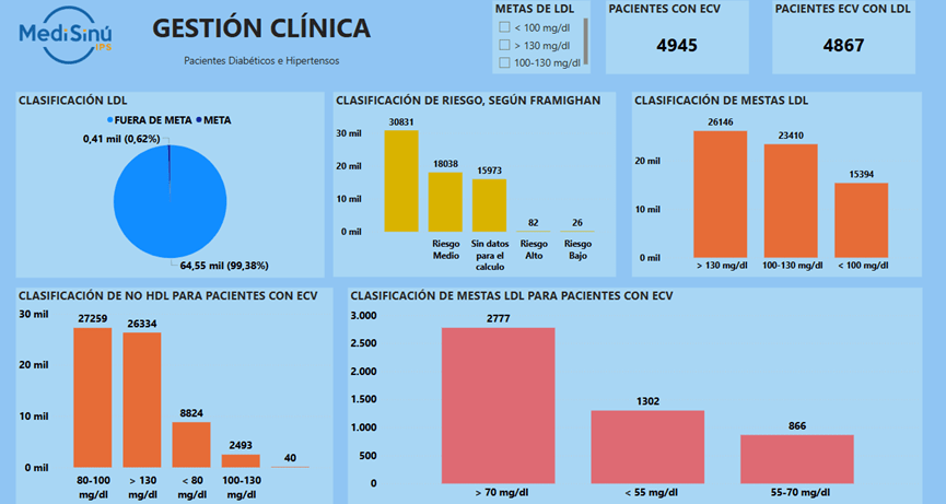 Las gráficas presentadas en los Anexos 1 y 2 corresponden a indicadores clave del tablero de gestión clínica de MediSinú IPS, enfocados en pacientes con diabetes e hipertensión. El Anexo 1 muestra la caracterización general de 64.950 pacientes, incluyendo distribución por patologías, sexo, clasificación del estadio renal e índice de masa corporal (IMC). Se evidencia una alta proporción de usuarios en estadios tempranos de enfermedad renal crónica y una prevalencia significativa de obesidad. El Anexo 2 detalla la subclasificación de 4.945 pacientes con enfermedad cardiovascular (ECV), con énfasis en metas de LDL, HDL y riesgo según Framingham. Se observa que una parte considerable no alcanza las metas óptimas de lípidos, lo cual resalta áreas de mejora para intervenciones clínicas personalizadas. Estos tableros permiten un enfoque analítico y predictivo para la toma de decisiones clínicas, alineado con modelos de machine learning descritos en el artículo principal.