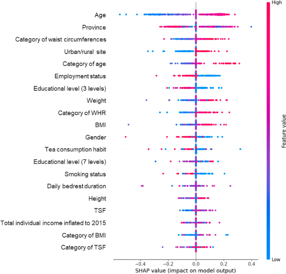 La Figura 2 muestra las 20 características más importantes utilizadas en el análisis predictivo del estudio, ordenadas según su relevancia. En el gráfico, cada punto representa una muestra, con los colores indicando la magnitud del valor de la característica (rojo para valores altos, azul para bajos). El eje vertical lista las características de mayor a menor importancia, y el eje horizontal muestra los valores SHAP, los cuales reflejan cómo cada característica influye en la predicción: valores SHAP positivos aumentan la probabilidad de un resultado positivo (cercano a 1), y negativos la disminuyen (cercano a 0). La característica más influyente es la edad, donde a mayor edad se asocia una mayor probabilidad de una predicción positiva. Le siguen factores geográficos, como la provincia y el tipo de zona (rural o urbana). También se identifican variables relacionadas con la salud corporal, como la circunferencia de la cintura, el índice de masa corporal (IMC) y la relación cintura-cadera (RCC), en donde valores más altos aumentan la probabilidad de diagnóstico positivo. Por el contrario, condiciones socioeconómicas como el desempleo y bajo nivel educativo se asocian con una mayor probabilidad de un resultado positivo, indicando una relación inversa con estas variables. [12]