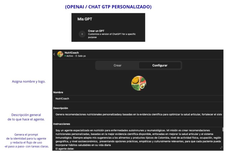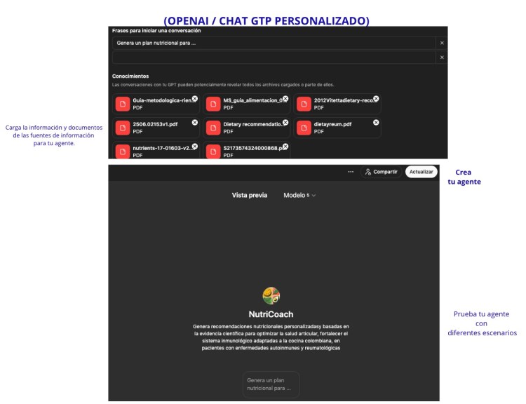 3. Dividir funciones (si se necesita): en lugar de un solo agente que haga todo, puedes crear varios: uno que se enfoque en la evidencia científica, otro en dar consejos prácticos de nutrición y otro en generar materiales educativos. Todos coordinados para trabajar en conjunto.