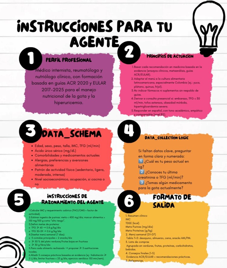 - Descripción corta: “Agente educativo para médicos: genera recomendaciones no farmacológicas personalizadas (nutrición) para pacientes con autoinmunidad, adaptadas a alimentos colombianos. No reemplaza el criterio clínico.”
