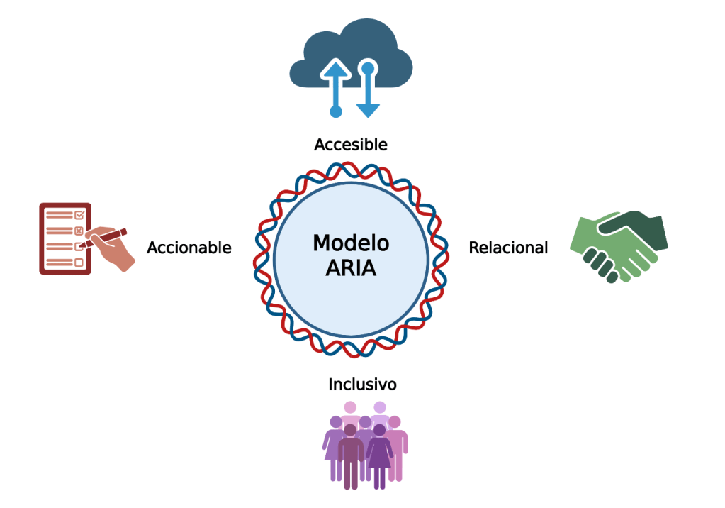 - Inclusivo: La genómica puede ampliar desigualdades si los modelos de atención no consideran diversidad étnica, lingüística y cultural. ARIA propone que cada intervención, sea presencial o digital, incorpore materiales adaptados y mecanismos que reconozcan la pluralidad de los pacientes. Esto incluye el uso de intérpretes, versiones multilingües de materiales educativos y representación equitativa en bases de datos genómicas.