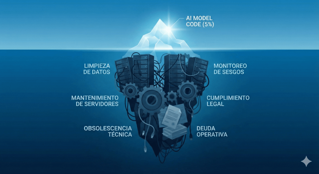 Figura 2. El iceberg de la deuda técnica. El código del modelo de IA (la punta visible) representa solo el 5% del esfuerzo total de un sistema funcional. El 95% restante —la infraestructura de datos, el monitoreo y el mantenimiento— es la «deuda técnica oculta» (Sculley et al., 2015).