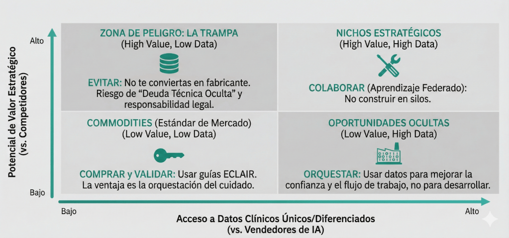 El estándar de prestigio ha sufrido un desplazamiento alarmante. Actualmente, el verdadero símbolo de “status”, debatido en las altas esferas y convertido en promesa corporativa, es la capacidad de decir: «Construimos nuestra propia Inteligencia Artificial«. Esta tendencia hacia el desarrollo in-house nace de un deseo legítimo de soberanía de datos y especificidad clínica, pero puede representar una falacia estratégica fundamental. Al intentar replicar infraestructuras de aprendizaje profundo que requieren economías de escala globales, los hospitales no están construyendo activos estratégicos; están acumulando pasivos operativos.
