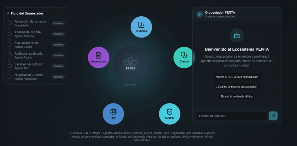 Estos sistemas no solo chatean; reciben objetivos complejos (ej. «auditar este caso de alto costo»), descomponen tareas, verifican evidencia clínica y escalan decisiones. En la práctica, esto significa la automatización real de la autorización, la auditoría y la conciliación clínico-financiera. El modelo Penta de OxLER, con su enjambre de agentes especializados, es la prueba de cómo esta orquestación libera al humano de la burocracia cognitiva y se convierte en un supervisor inteligente secuencial.