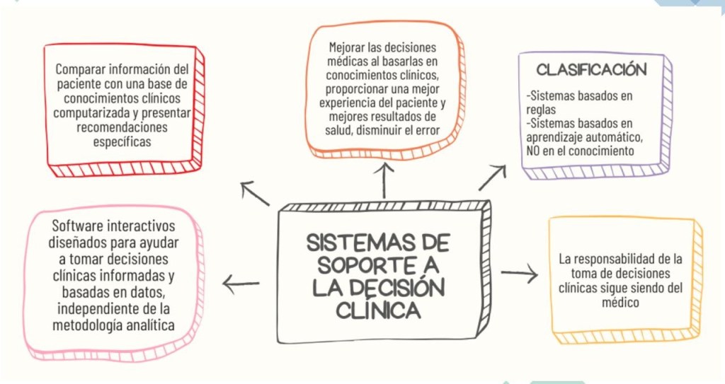 Primero, aclaremos qué es un Sistema de Soporte para la Decisión Clínica, es básicamente un asistente digital que le avisa al médico cuando algo no cuadra (como si fuera un copiloto que le dice: «¡Ojo! Ese paciente es alérgico a lo que usted le va a dar»). La diferencia con la Inteligencia Artificial es que el sistema de soporte tradicional solo sigue las instrucciones fijas que nosotros le programamos de antemano (si pasa A, entonces diga B), mientras que la Inteligencia Artificial tiene la capacidad de aprender por su cuenta analizando montañas de datos para encontrar riesgos o patrones que nadie le enseñó a buscar explícitamente.