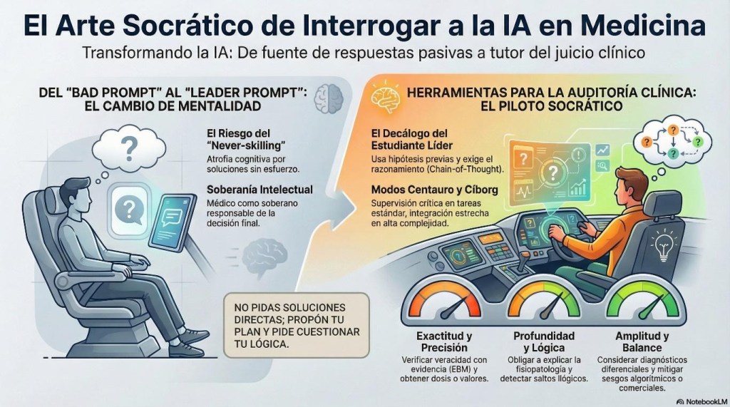 - El Prompt Socrático (Leader Prompt): Aquí la IA asume el rol de un tutor provocador. El usuario no pide la solución, sino que propone su lógica para ser desafiada. Ejemplo: «Voy a proponerte un plan de manejo para una neumonía pediátrica. Tu rol es ser un consultor socrático: cuestiona cada uno de mis pasos basándote en la evidencia actual y señálame los posibles errores en mi lógica de dosificación».