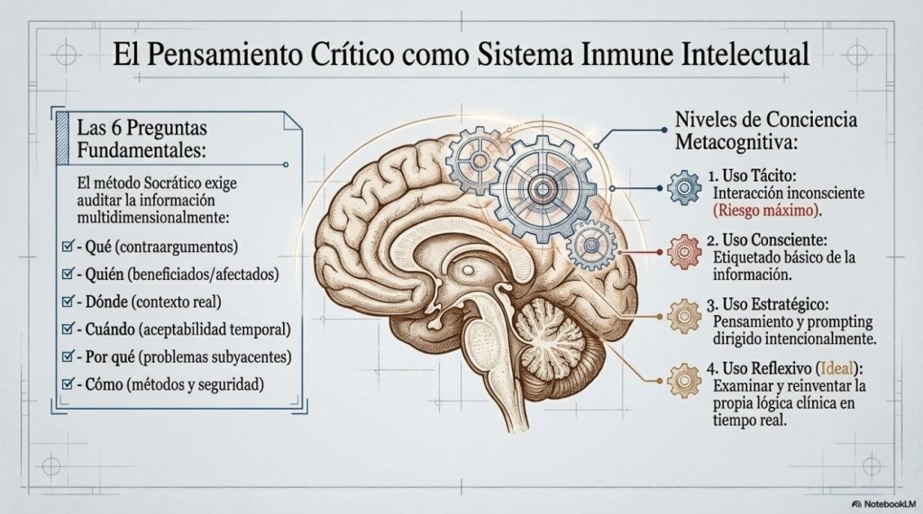 Si el estudiante se salta el proceso de razonamiento clínico porque un algoritmo entregó el diagnóstico y el tratamiento aún caso o problema clínico, nunca desarrollará las conexiones neuronales necesarias para el ejercicio profesional autónomo. Estamos creando una generación de profesionales que conocen la respuesta, pero son incapaces de reconstruir el camino que lleva a ella.