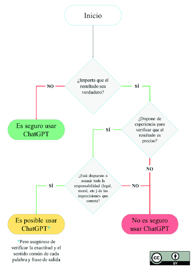 Diagrama de flujo para el uso seguro de ChatGPT. Fuente: Sabzalieva y Valentini (2023; diseño de Aleksandr Tiulkanov; rediseño de Fraidy Alonso Alzate Pamplona; bajo licencia de Atribución CC BY; fuente: Al and Data Policy Lawyer).