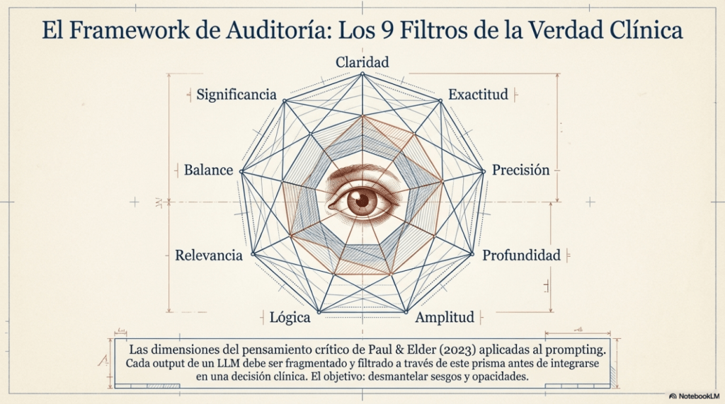 Para blindarnos contra el vibe knowledge, las alucinaciones algorítmicas, los sesgos propios del modelo provenientes de los datos de pre-entrenamiento, el aprendizaje por refuerzo (“sycophancy”) y los sesgos propios del humano (confirmación, automatización, etc.) cada interacción debe ser auditada mediante las dimensiones del pensamiento crítico de Paul & Elder. Estos filtros constituyen nuestro sistema inmune intelectual:
